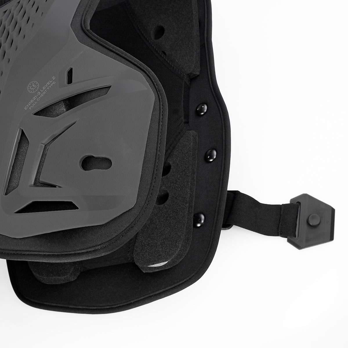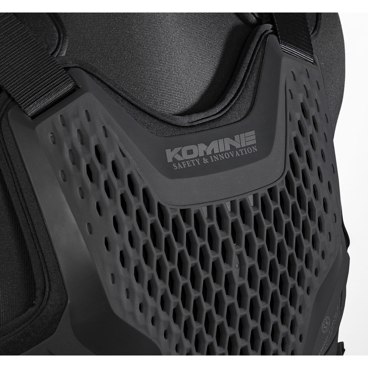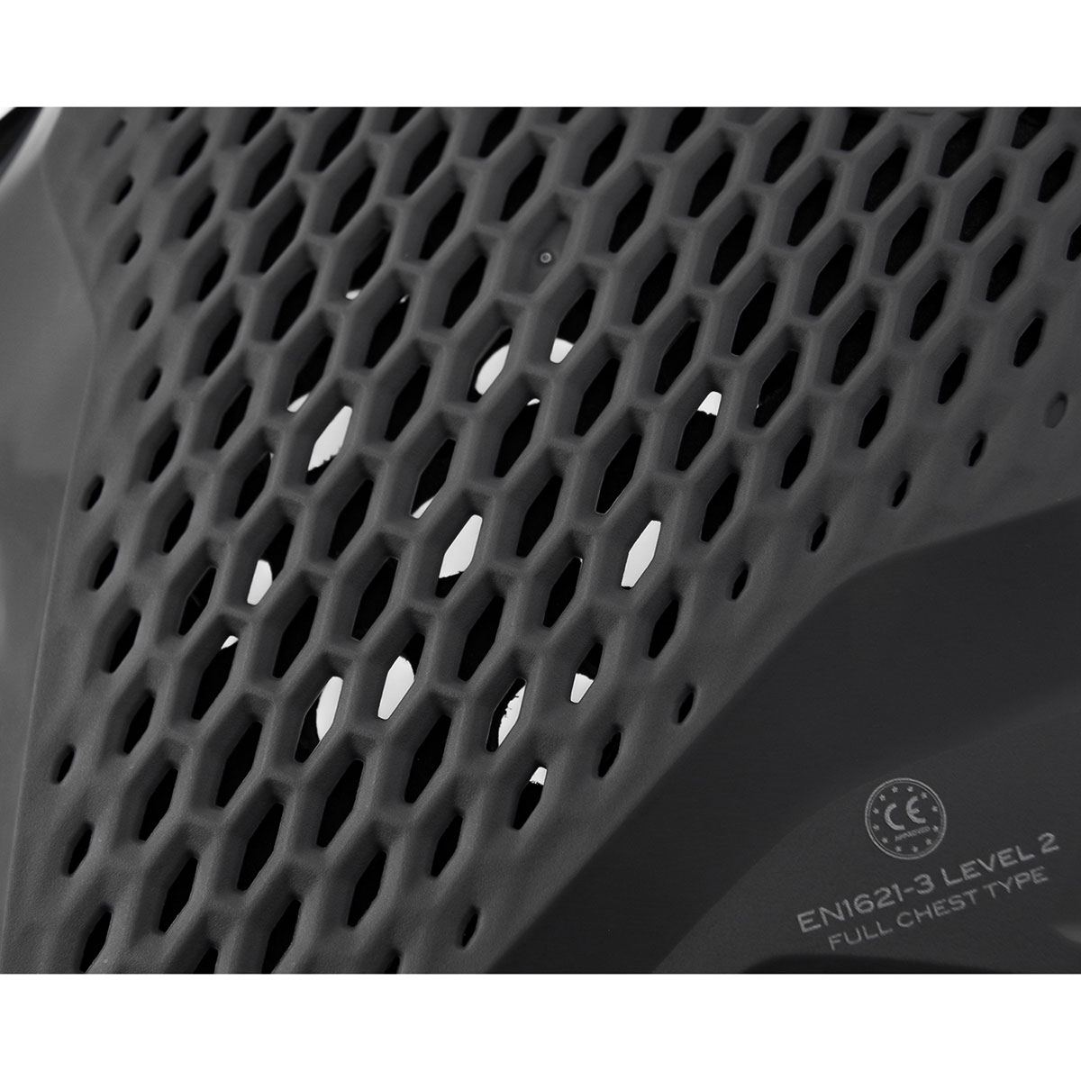 多数の通気孔を設けながらも強度を確保したプラスチックシェルと、同じく通気孔を備える撃吸収フォームを組み合わせにより、胸部、背中ともにCE規格レベル2の保護性能を発揮。