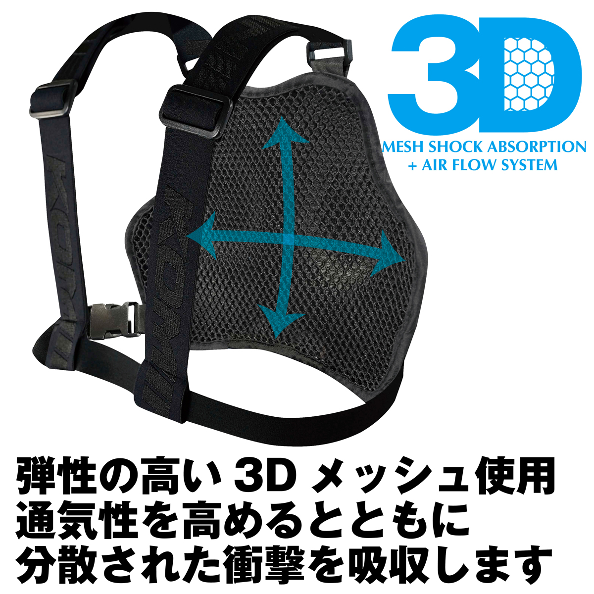 KK-906ドライカーボンチェストシールドを内蔵できるプロテクターベース。通気性の良い伸縮生地と3Dメッシュを使用し快適性を追及。伸縮ベルトで装着し、ジャケットの外でも中でも着用可能。