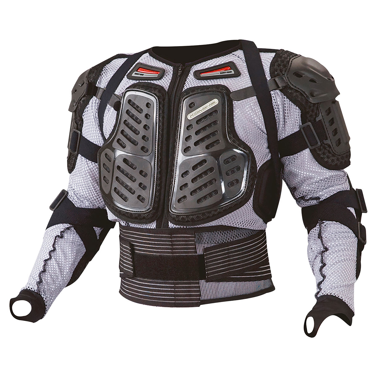 Made of high impact injection molded plastic on elbows・forearms・shoulders・chest and spine guards with tail bone protector. Protection on the ribs and collar-bones reinforced. Elastic kidney belt with dual Velcro closure for better fit. Removable back protector via vertically mounted zippers. A very light weight but durable mesh net attaches all the pieces of armor